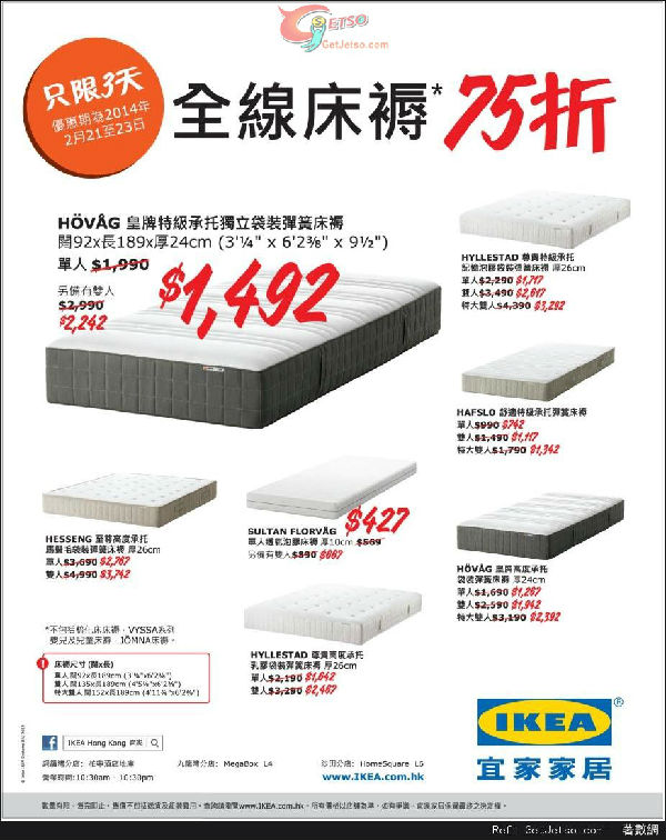 香港打折:宜家家居全线被袋套装及床褥75折优惠(至14年2月23日)
