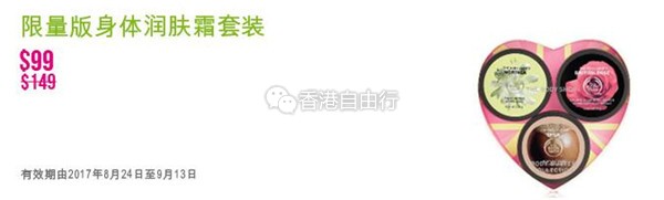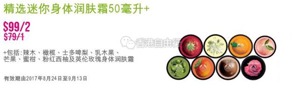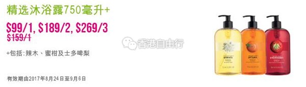 2017-08-23 微信红包微币天天送,关注微信号: hkziyouxing (长按左边红色字复制)获取福利和最新香港购物优惠折扣信息香港打折:润手霜、沐浴露、生姜洗发水等 the body shop门市最新优惠(8月24至9月13日)