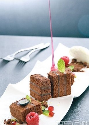 还未推出的新甜品,朱古力蛋糕内有朱古力Ganache,加上红莓Jelly、原粒经拉糖的榛子仁和新鲜蓝莓肉,甘、酸、甜,一次过尝尽不同特色。.
