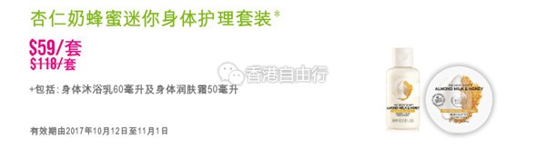 2017-10-11 微信红包微币天天送,关注微信号: hkziyouxing (长按左边红色字复制)获取福利和最新香港购物优惠折扣信息香港打折:按摩油、润肤霜、洗发露等 the body shop门市最新优惠(10月12至11月1日)