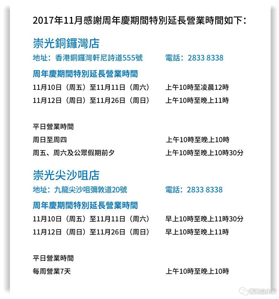 2017-11-07 微信红包微币天天送,关注微信号: hkziyouxing (长按左边红色字复制)获取福利和最新香港购物优惠折扣信息压轴年度购物盛事又到了!这次崇光感谢周年庆将于11月10日至26日举行,Kiehl’s尖沙咀店精心挑选一连串的独家惊喜礼遇!