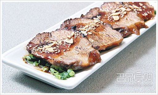 厚切猪脊肉以自制酱油腌过,即点即烧,香喷喷,连葱吃,肉肥瘦均匀且有咬口,愈嚼愈滋味。
