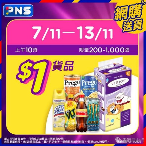 $1产品电子优惠券:买网购送货订单即可以$1优惠价购买精选产品,每日上午10时准时开抢,限量200-1000张