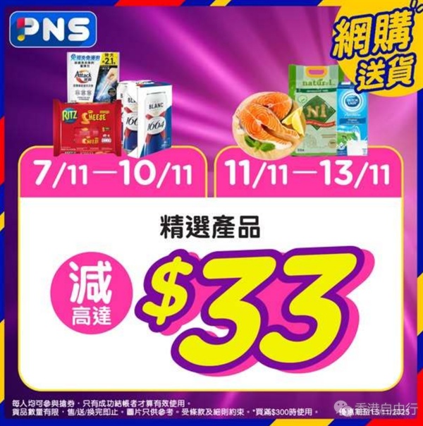 一系列购物优惠来袭。百佳超市推出双11优惠,由11月8日起一连4日88折,于门市和网店购物均可享有优惠,折扣无上限,买得多悭得多。另外,由即日开始一连7日,PNS网购每日大派$30电子优惠券、$1产品等优惠。