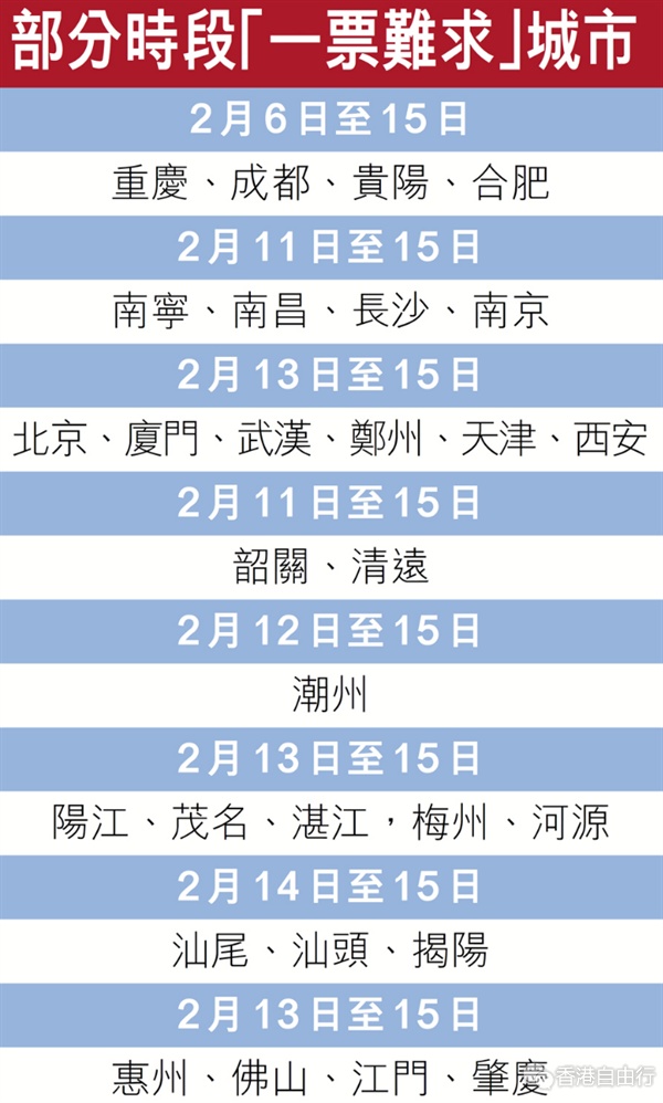 同时,香港高铁开往粤东西北地区的车次也十分抢手。粤西、粤北方向,香港高铁2月13日至15日前往阳江、茂名、湛江,梅州、河源的车票均已卖完;至于潮汕籍港人较为集中的粤东方向,香港高铁2月12日至15日前往潮州的车票已被抢购一空。