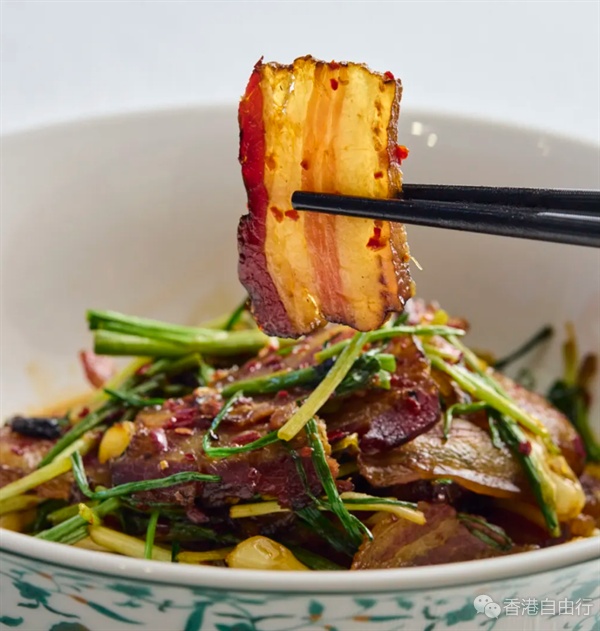 水芹菜炒湘潭腊肉:经过时间熏制的腊味 ,与水芹菜的清新形成绝妙对比 。腊味不再油腻,青菜更具风骨,阴阳平衡,相得益彰。