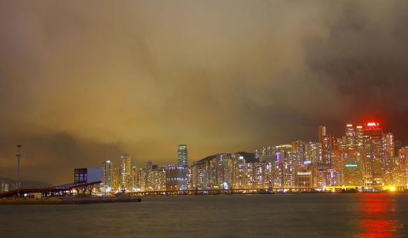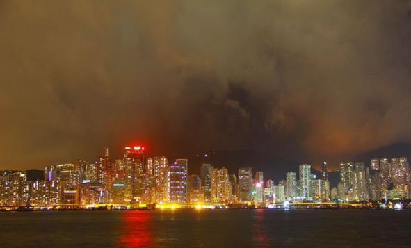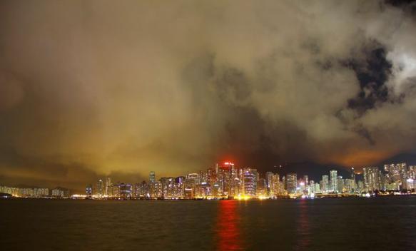 云层很厚,在灯光的映照下港岛仿若未来世界
