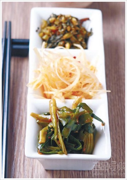 款式会不时转换,不过通常是辣味雪菜、辣味韮菜及用味醂调味的京葱丝,佐酒、伴面均可。