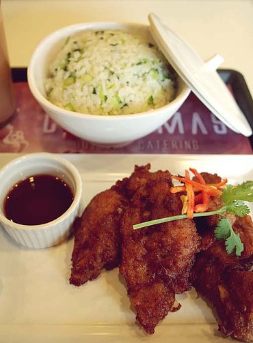 猪扒菜饭。 晚餐吃这一碗菜饭+一块猪扒刚刚好,我以为。其实猪扒大到根本吃不完。大概是怕猪扒油腻,所以菜饭做的清淡。我滴了2滴酱油在里面,自从看了黄油拌饭,我就喜欢滴2滴淡口酱油在里面调味。很香。