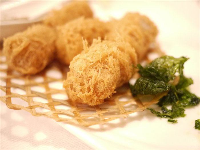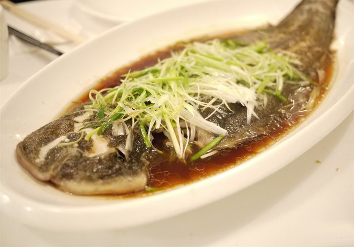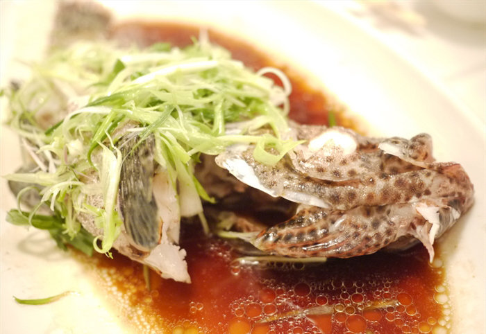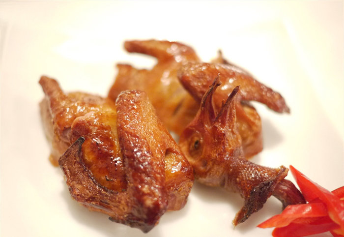 那夜的鸡油花雕蒸花蟹深入人心,还未见上桌就已闻到阵阵的酒香飘来。两斤重的花蟹膏满肉肥,爽甜无比,令在座绅士淑女也顾不得仪表,大刀阔斧地一扫而光,然后将店家自制的陈村粉放入黄澄澄的混有十年陈花雕酒的鲜鸡油中捞着吃,滋味鲜美口感嫩滑,很是过瘾。龙井菊花熏乳鸽来头不小,这乳鸽是美食家江孔殷太守的孙女、著名食谱作家江献珠为店家特地寻来的优质上品,鸽肉细腻鲜嫩多汁,骨质很软,似有若无的龙井和杭菊香带出浓浓的烟熏味,飘渺却打动人心。十八味鸡是每桌都不错过的,花椒、豆蔻、八角、丁香加豉油调制的卤水浸制本地的三黄活鸡,香料味窜鼻,鸡肉嫩滑鸡味浓郁,吃不停箸。酥炸狮头鱼配陈醋也是见菜名就有冲动点,狮头鱼是新鲜海鱼,在清橄榄汁中浸足二十四小时令其鱼骨软化,炸得鱼皮金黄香脆,鱼身鲜美多汁,自制陈醋加了鱼露和柠檬调味,口感浑厚醇香,立即提升鲜美层次。