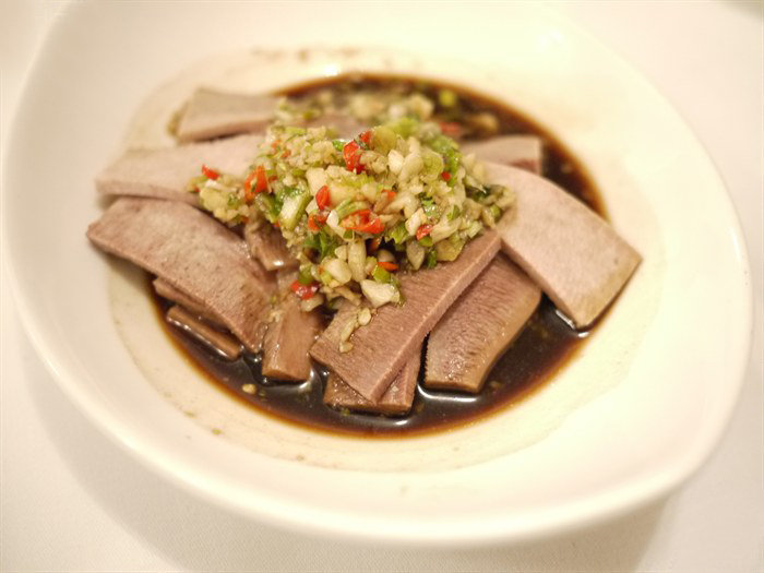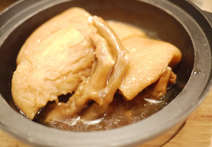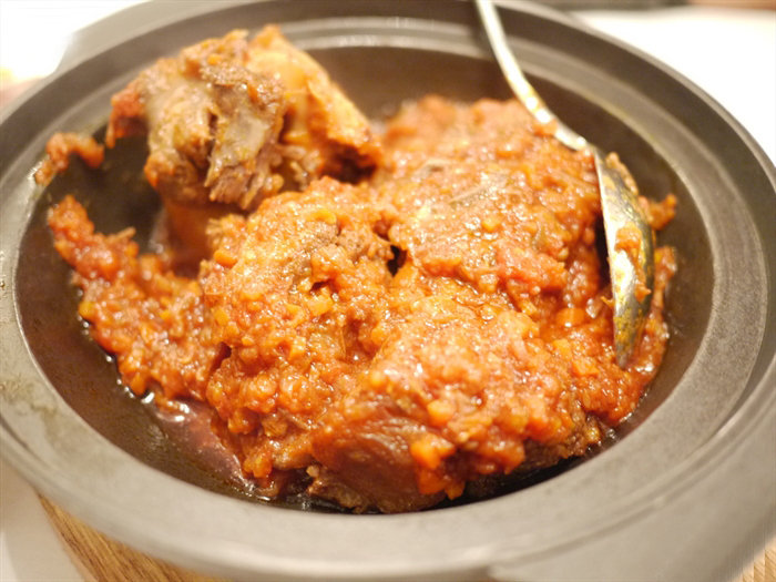 冬菇羊肚菌炆腐皮是店家原创菜式,羊肚菌是无沙石的上等货,口感柔嫩;千层腐皮则来自深水埗的六十年老铺树记,大厨每天一早赶去排队购买,只为它的香浓豆味和冠绝全港的品质。层层腐皮吸收了羊肚菌和松茸的鲜香,虽然是一道素斋,但味道好似荤菜般有厚度。糖醋排骨吃得多,带话梅和肉桂味的一定别家吃不到,深红色的排骨肉刚好脱骨,软酥无比,一咬爆汁,好吃到吮手指。波酒焗牛尾,牛尾炖了一天一夜到酥烂,加入波酒,裹上蕃茄蓉,入口肉香十足夹杂鲜活的蕃茄酸甜味。