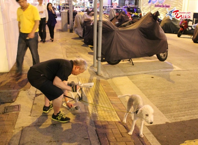 下图为10月27日晚,一位香港市民正在用报纸处理小狗的粪便,这不禁让人赞叹港人遛狗的素质可见一斑。