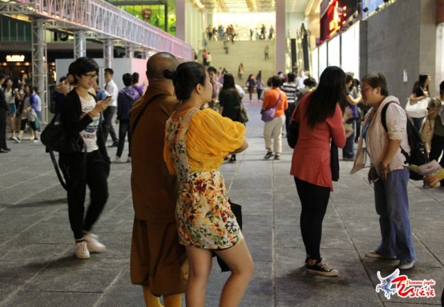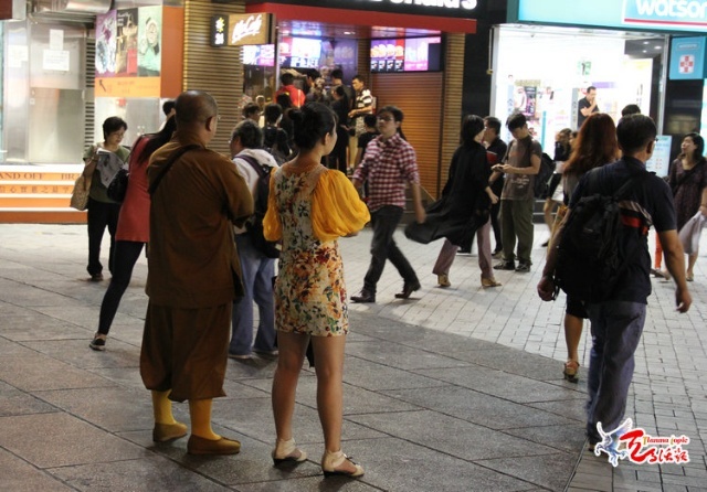 下图为香港海港城外,一僧人携手一位齐臀美女。