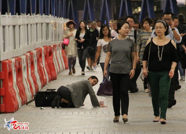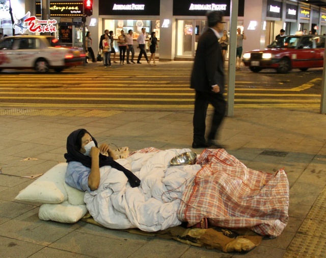 香港立法禁止街头乞讨,前提是香港有着完善的社会保障和紧急救助措施。下图为中环附近,一位内地妇人全副武装,在街头乞讨……