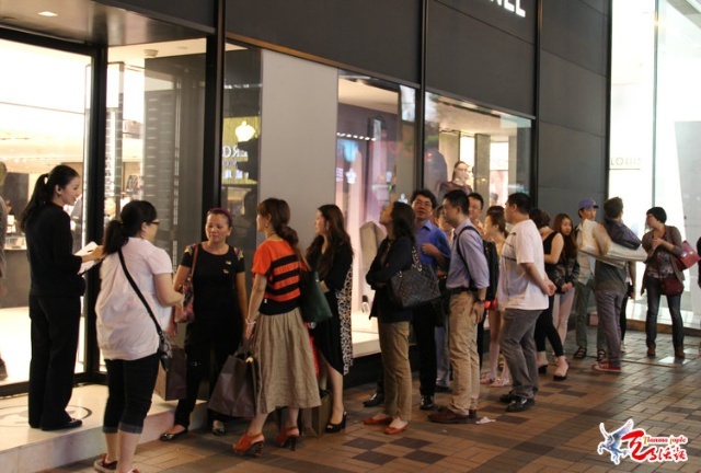 下图为广东道一奢侈品店外被限流的内地血拼游客。