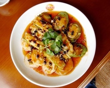 「煎酿三宝」通常是在鱼肉酿茄子、尖椒、圆椒或豆腐中任选三种。一般人以為鱼肉愈多愈好,其实做得好吃也讲比例,一分鱼肉三分菜的比例口感便最佳。鱼肉以要手打、入口弹牙為之正。