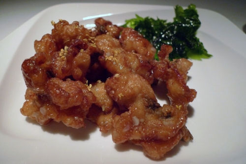 天外天做粤菜,简简单单的菜单,经典与现代风味俱备。菜名一目了然,甚有西餐风格。高级海鲜吃法是粤菜经典,不过我还是倾向于尝试各种有特色的小炒。桂花蜜汁鳝球是招牌菜之一,用的是白鳝,切片后腌制过再微炸,加了蜜汁,而这蜜汁是餐厅自己调制过,没有那种让人紧张的甜,我觉得给鳝片增加的不是味觉本身的成分,而是吃口的细腻感,而桂花也是上桌前才洒在上面,闻起来香,并不融在吃口中。搭配的是玻璃菜,即用油跑过的紫苏叶。说是鳝球,其实是鳝片,我想叫做鳝球大概是因为炸过之后其形如球吧。吃在嘴里不是那种可想而知的脆,炸得过脆一般都是需要牺牲肉质的,而这鳝球吃起来只有在入口的时候有略微的脆爽,接下来却是细腻回味的酥润。