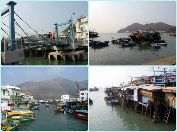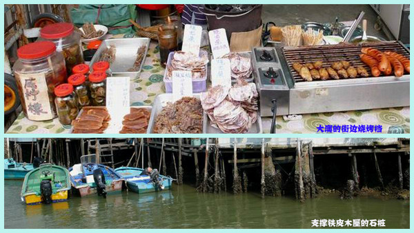我们一进大澳,首先是经过一座浮桥,“20元乘游船环游渔村,还可出海看到海豚”的游船广告随外可见。河的两边全是建在水中的木屋,有的很破旧,是很典型的水上人家,看那铁皮木屋下面的长桩沾满了海蛎子,就知道年代已久,回想中环的繁华,觉得有那么一点点不可思议。