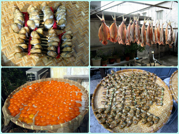 家门口的阳光下,晾着海产品,还有金色的鸭蛋黄;在店面和中心大街两旁售卖着大澳特产:咸鱼,虾酱和鱼肚等。