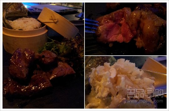两款菜式放在黑色石碟上牛肉粒当晚煮得略为熟了一点大部份肉汁流失了 (但我食牛扒只要五成熟的)