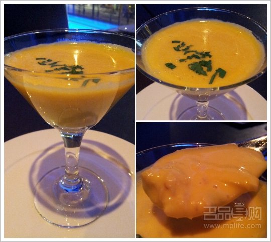 是以新鲜南瓜制作而成的汤再加入份量十足的蟹肉在浓郁的南瓜味中增添鲜味而最特别的是这个汤不用中国传统汤碗盛装反而以西式碗盘呈上令整个南瓜汤更添西方色彩