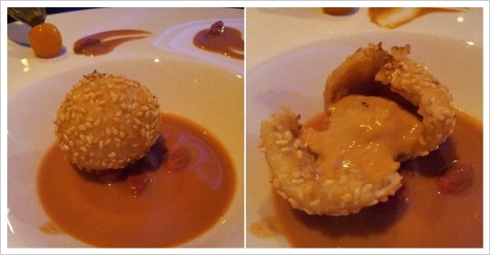 女孩子总爱吃甜品我特别喜爱焦糖炖蛋但看这个甜品的卖相究竟焦糖炖蛋在哪里呢大厨希望食客可以在新年吃煎堆应节但又想给各食客一点惊喜所以将焦糖炖蛋放到煎堆中作馅料再配上幼滑的焦糖汁和中式杞子真的令我十分回味~~~中西合壁的材料和制法真是配合得天衣无缝