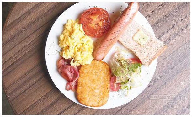 碟上挤满了肠仔、烟肉、薯饼、西红柿、多士,还有加了牛奶的滑溜炒蛋,属饱肚之作。