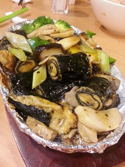 这是一道有气势的菜式,用上的是包了锡纸的铁版,一件件颜色做成鲜明对比的紫菜卷呈现於眼前,用上的是紫菜卷上腐竹,配合少不了蔬菜类,再淋上黑椒汁而成,我还真不是黑椒汁的爱好者,基乎每一次可以选的话都先把黑椒汁第一时间去除,再选蘑菇汁或蒜蓉汁,所以本来对这个菜已有点先入为主,而且对这个菜的口感还真的不太喜欢,可能是因为还是喜欢吃脆香的紫菜吧。