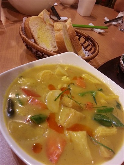 开宗名义,这就是一道素咖哩, 咖哩汁算是做得不错, 但咖哩汁有微微的辣味, 浓度亦很合宜, 拌饭的话亦不失为一个好选择, 没有一点肉, 取而代之的是不少蔬菜-- 青椒, 红萝卜, 薯仔等等, 但总觉得吃咖哩没有肉, 总有点不习惯; 伴上的法包是稍为付人失望之作,包身点为过硬,没有想像中的面包松软感,但沾了酱确有变软一点; 面包上的牛油好像点为大够大器, 不够牛油香, 这是相对平实的一道。