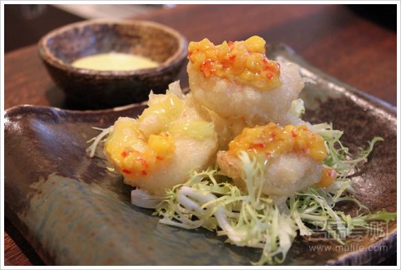 「山葵炸虾伴墨西哥芒果汁」是将虾去肠切成虾球状,炸脆后伴以自家制的山葵蛋黄酱及墨西哥式的芒果酱汁。虾球肉嫩,炸得香脆不油腻,加上山葵的辛辣混合芒果的香甜,是开胃的小吃之一。配上店的Chuhai饮品系列尤其出色。