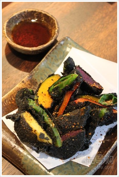 「墨汁蔬菜天妇罗」以不同的时令蔬菜沾上薄薄的一层粉浆。粉浆混合了食用竹炭粉,色泽黝黑真如炭块一样。炸蔬菜的外层特薄,质感香脆可口。蔬菜的种类不少,包括灯笼椒、秋葵、蕃薯及日本南瓜等。蔬菜本身清甜,不经调味但轻蘸酱汁享用,香脆之余也是下酒的最佳配搭。