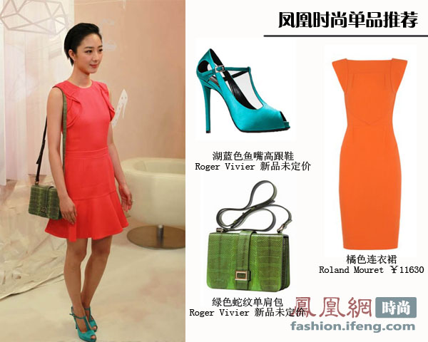 桂纶镁身着朱红色连身裙,搭配RogerVivier绿色蛇纹单肩包和湖蓝凉鞋,轻松掌握大牌的撞色技巧,有点波普文艺的味道,但是露额头的发型让她有点显得老气。