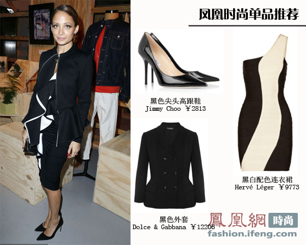 经典黑白配色连衣裙搭配Manolo Blahnik黑色尖头高跟鞋,尽显成熟稳重,有褶皱伞摆设计的简单外套让妮可·里奇更加优雅。从妆容到肤色再到服装,一身黑色未免太过暗沉。