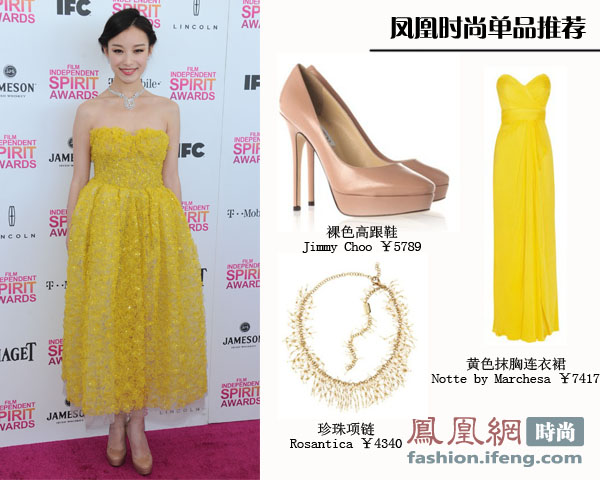 倪妮一身黄色抹胸蓬蓬裙,搭配简单的编发,复古味十足,鲜亮的颜色衬出倪妮白皙的肌肤,礼服精致的做工更显倪妮的高贵气质。不过Giambattista&louboutin裸色高跟鞋和亮黄色礼服不太搭,换成同色系的芭蕾鞋或者亮片高跟鞋会更好。