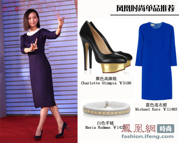 刘诗诗一袭深蓝色连衣裙大方优雅,白色的圆领又多了几分文艺气质,搭配思加图的蓝色螺丝钉高跟鞋,在颜色上又与服装相呼应,外加白色手链的一点装饰,简单自然又十分大气。