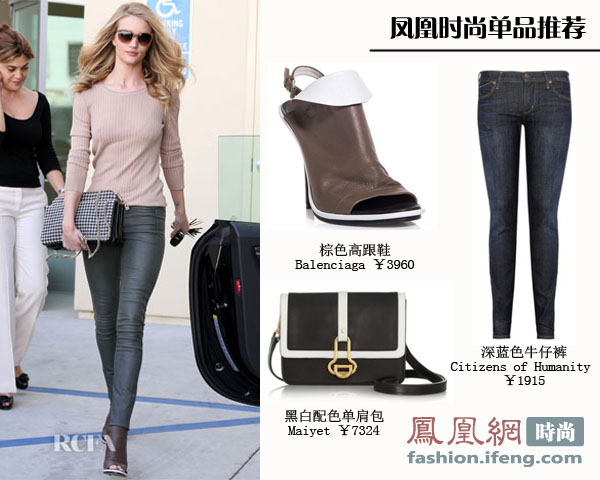 简单的裸色针织衫搭配深蓝色牛仔裤,脚踩Balenciaga棕色皮革鱼嘴高跟鞋,手拿经典黑白配色的单肩包,既干练又帅气,将大明星街拍的架势不由自主地展现了出来。