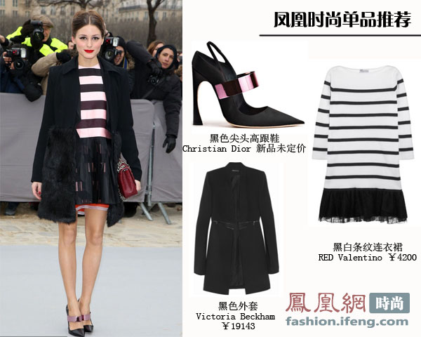 简单的盘发搭配黑色风衣拼皮草的外套,内搭黑白条纹拼黑纱伞摆连衣裙,脚踩Christian Dior2013最新款——粉色金属拼黑色皮革高跟鞋,这一身拼接混搭,尽显奥利维亚·巴勒的贵气与高雅。