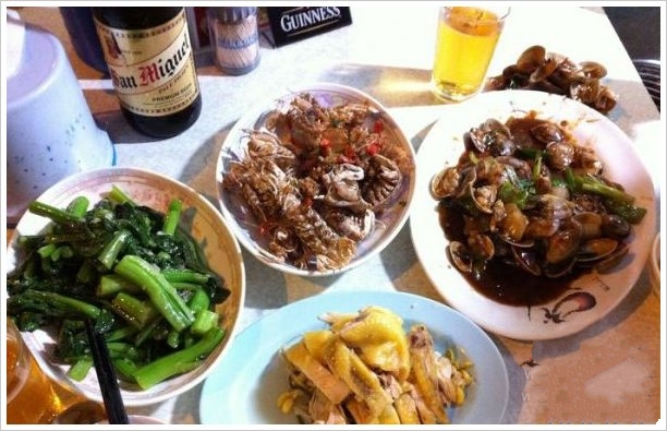 食物:椒盐濑尿虾(68) 炒蚬(48)蚝仔粥(25)蒜泥炒菜心(33)盐焗鸡(48)