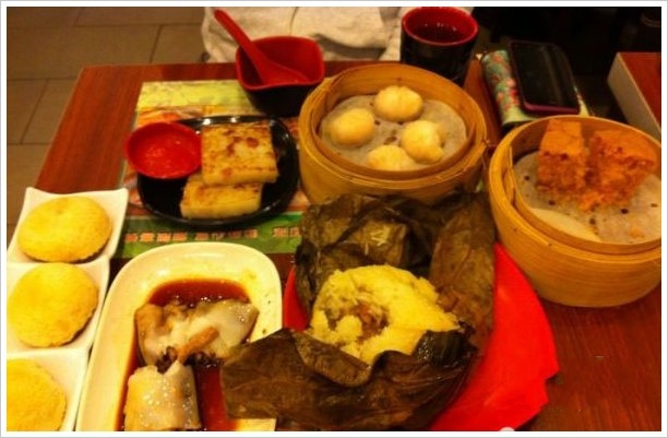 食物:酥皮叉烧包(15) 晶莹鲜虾饺(22)古法糯米鸡(23)香滑马拉糕(14)煎腊味萝卜糕(12)黄沙猪润肠(17)