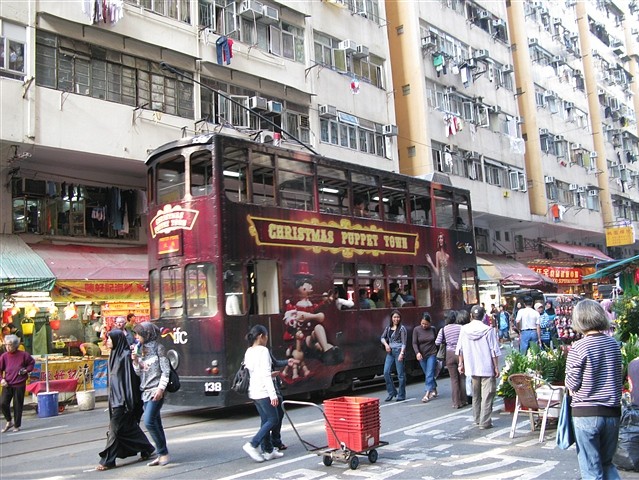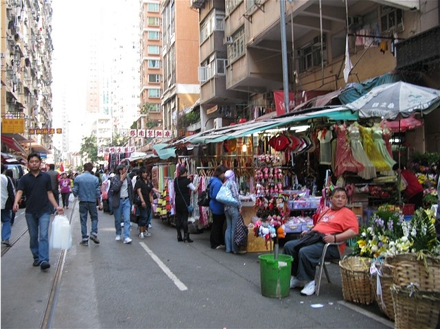春秧街的街道杂乱且潮湿,偶尔还有古老的有轨电车穿街而行,街道的两旁几十年前的堂楼下边,是一家家小店,衣服、袜子、鞋帽,南北水果、海产﹔闽南地瓜、花生、柑桔,牛羊猪肉、鸡鸭,海鲜,应有尽有。如果不是卖主的口音,我真觉得是在北京的哪个农贸市场。这就是春秧街——北角的地标,据说也是港岛变化最小,最能反映香港平民生活的街道。朋友调侃说,想要看看香港最真实的一面,春秧街是最佳的去处。