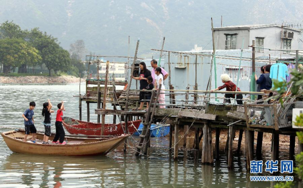 5月1日,大澳水乡的三位小朋友乘船回家。