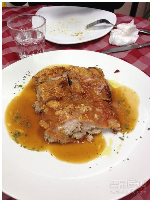 西班牙烤乳猪配青葱薯蓉和红椰菜:采用越南15天大乳猪,体型小、肉嫩,以明火焗炉烧香;骨头及手脚则用来熬汁,与鬆脆的乳猪一同食用,原汁原味。整只点叫,需要两天提前预订。脆皮与肉身相连,湿润而富韧性的;金黄色、闪亮得透光。