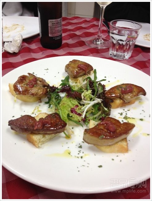香煎鹅肝配蒜蓉包火箭菜:外脆内软,,入口即融,鹅肝有时会煎过头一点点,蒜蓉包沾满鹅肝溢出的油脂与蒜搭配,香腻饱足。但摆盘一般。
