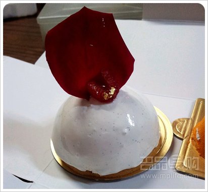 这个是Lychee Dome, 用了玫瑰花瓣作装饰点缀, 令红白两色起了很大对比.