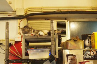 出了电梯,找到一家小小的门面,虽然地方不大,但是桌子摆了不少,相对猫咪活动的空间就小了很多。这是不是猫咪们都很懒惰的原因呢...