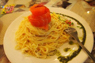 青酱烟三文鱼天使面(貌似是推荐菜式,中规中矩,罗勒味很好闻)