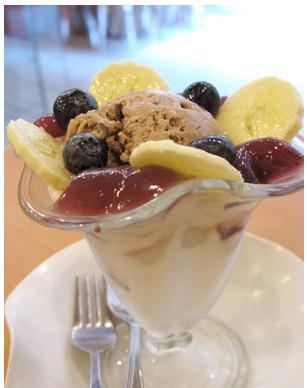 等了十分鐘小王子来了,有香蕉、鲜蓝莓、心形啫喱环绕著在中间的碎朱古力雪糕,深入一点还有烟韧的蓝莓粿子,蓝莓确实有微微的酸。香蕉含有色胺酸,有助紓缓紧张情绪,使人的心情快乐,因「失恋」而失眠的话,睡前吃香蕉能够改善失眠。其实,失恋的感觉可以不酸溜溜,不如像雪糕一样溶化掉。