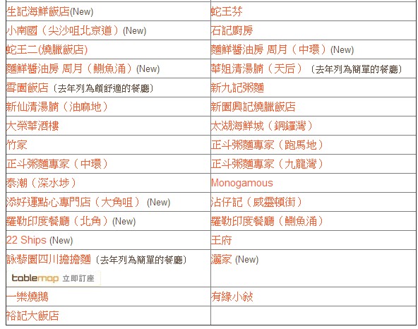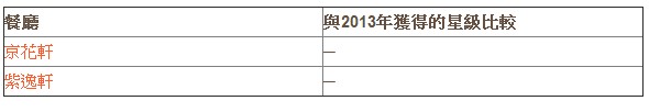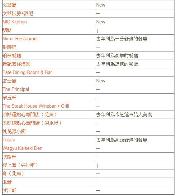 二星餐厅与去年一样总数不变,Wagyu Takumi新上榜即夺二星,而明阁及夜上海(尖沙咀)今年则降为一星级别。