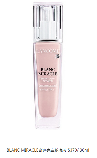 lancome全新BLANC MIRACLE BRIGHT-LIGHT CREATOR将防晒功效提升至SPF50+ PA++,结合彩妆和护肤的多重功效。蕴含天然成份玫瑰萃取精华及白色篮宝石粉末,令粉底液和粉饼极致亲肤,缔造柔焦效果持久的妆容。新品糅合多种化学及矿物隔离成份的强效配方,阻隔紫外线,防止黑斑形成,并利用先进的Pollusafe科技保护肌肤,对抗环境中的污染物,粉底液更注入双倍防护因子及Ultra-Fit科技,能够于肌肤表面形成幼滑无瑕的薄膜,达至完美遮瑕的妆效,亦可带来轻透的细滑质感。