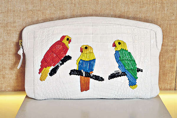 Nancy Gonzalez今季的作品製作十分刁钻,先将鱷鱼皮切成幼条,再於白色的鱷鱼皮上编织成鸚鵡图案。品牌CEO Santiago 指製作的概念早於三年前已经浮现,但因為製作难度高,所以反覆测试,直至今季才有信心推出市面。($24,300 )